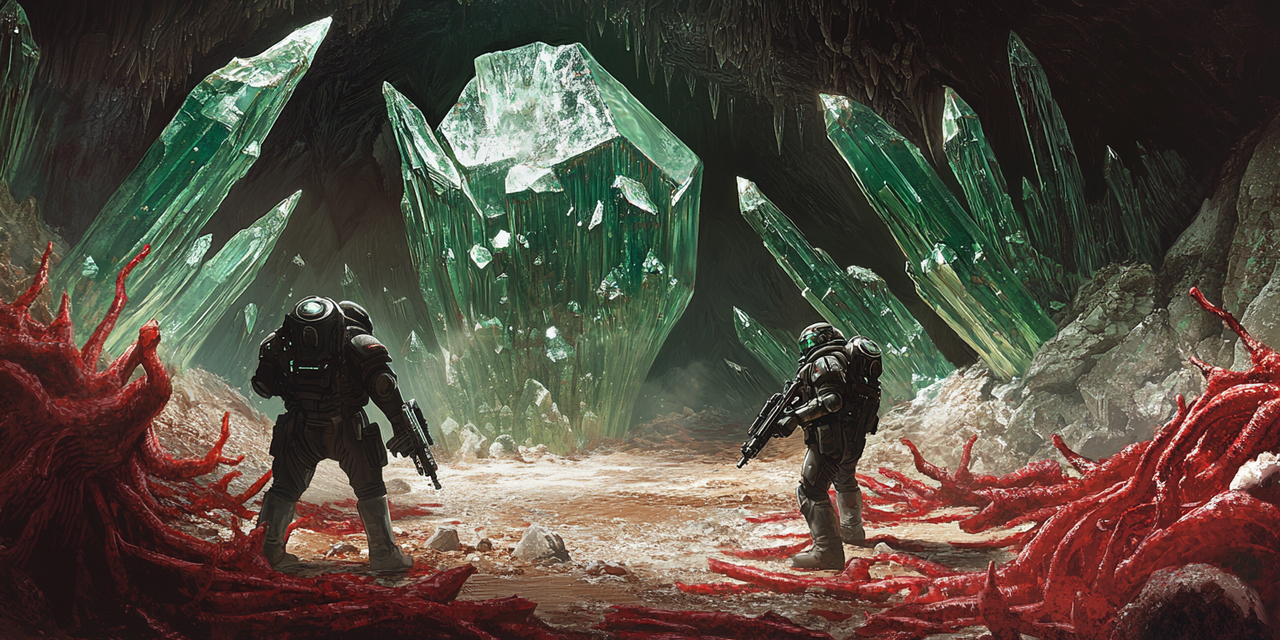 As the group pressed further, the ground sloped into a dark cave entrance, half-hidden by mushroom stalks and twisted wreck debris. ARI's sensors pinged faintly. Maximilian motioned for caution, and they advanced slowly, weapons raised. Flicking on their suit lights revealed veins of crystallized growth that pulsated with an eerie glimmer, and among them, newly infected creatures — their carapaces laced with jagged crystal shards.