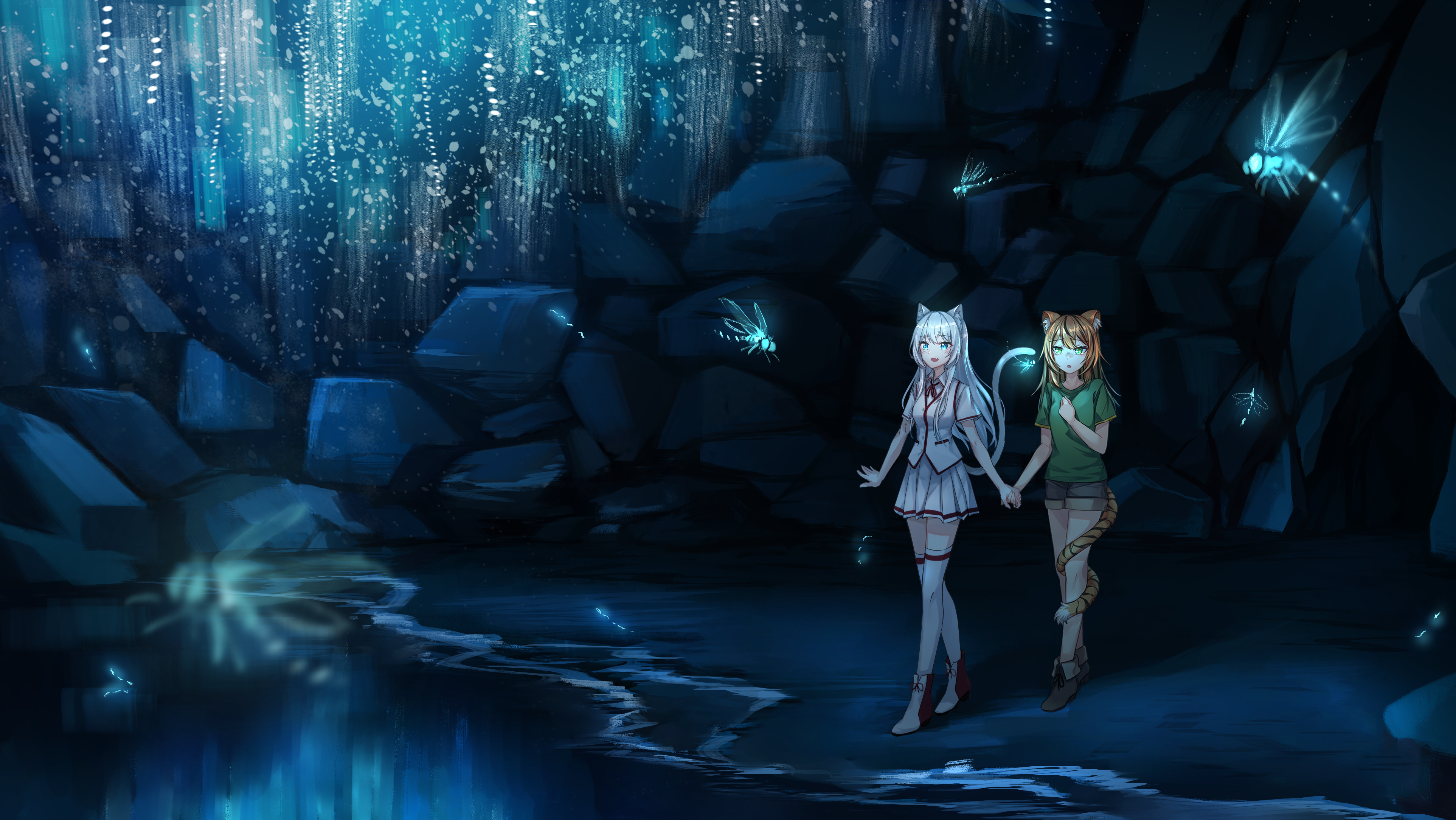 "But it looks so pretty!" The cat looked at the beautifully illuminated ceiling created by the blue light of the glowworms that was even reflected by the lake's surface.