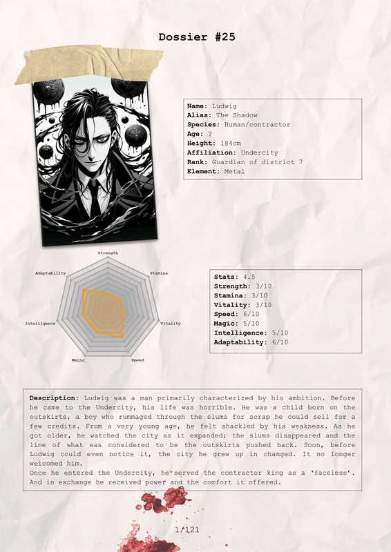 Five other guardians assembled behind him, each stranger than the last. There was a tall, muscular man with short crimson hair, a thin nun with crosses tattooed on her eyes, a lanky, pale, slouched over mime with disproportionally long arms, and a white-haired man with red piercing eyes and a bored expression. Ludwig was there too, staring intensely at Ulmak with a strange sense of satisfaction on his face.
