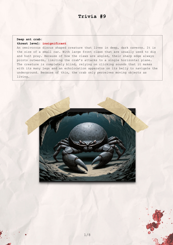 "Judging by the sound and size, it's a deep ant crab," Zeke said while grabbing onto the back wall of the cavern. "Watch out for its claws. They're quiet, sharp, but can only strike horizontally, so as long as we avoid a direct line of sight, we should be fine," Zeke explained in a shaky tone.