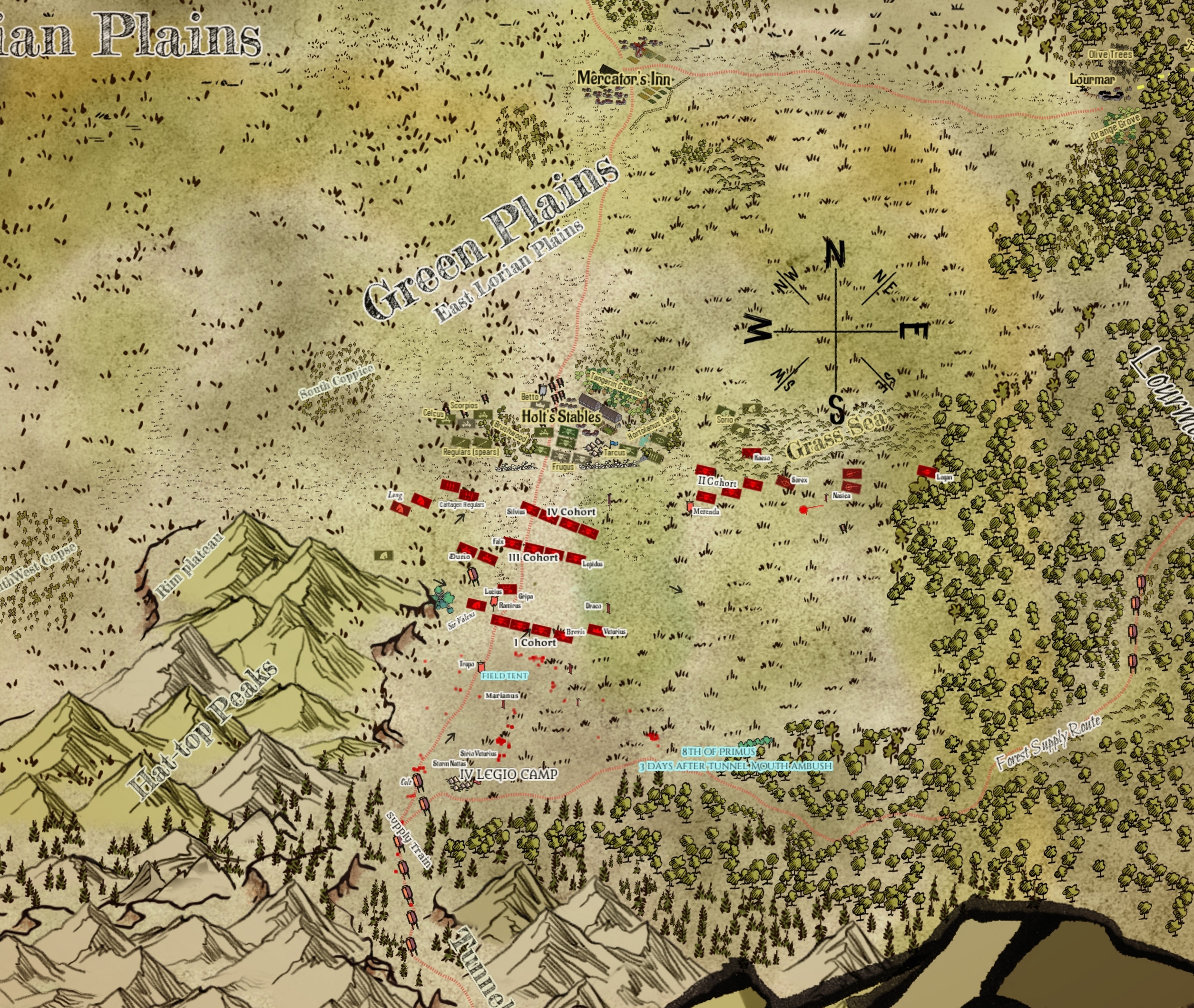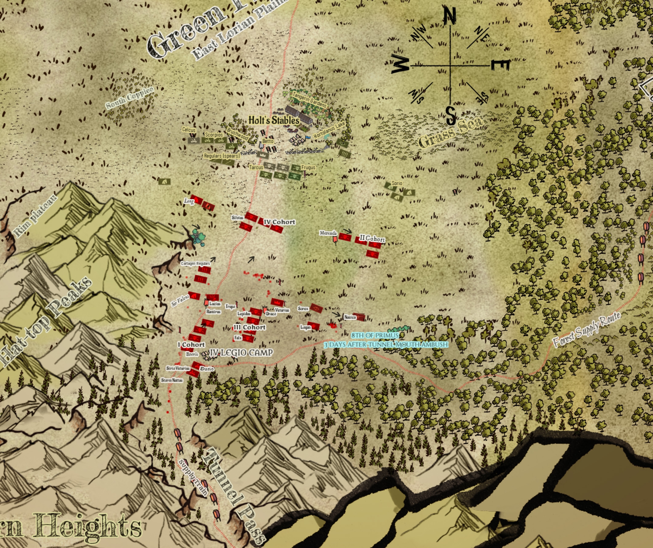 "Gaeta has men facing the Brushwood," Galio added. "Long is sweeping the plains looking for any hidden surprises and Draco pivoted the First Cohort that way to control that flank better."