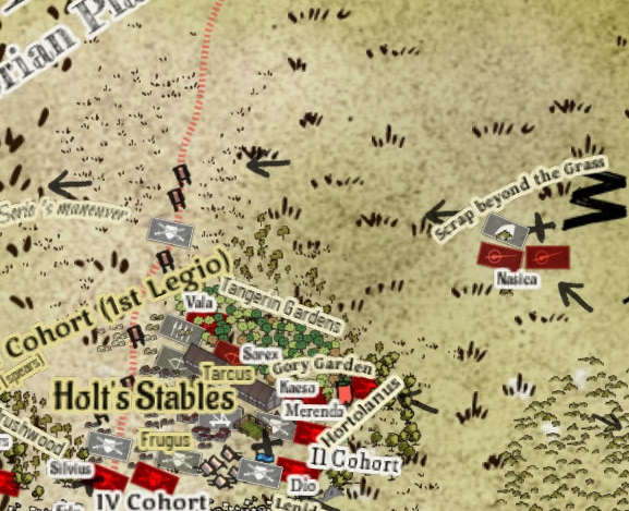 Nasica found the roaming enemy cavalry and won a fierce engagement in the 'Scrap beyond the Grass Sea' but got injured falling from his dead horse. Despite his injury he refused to abandon the field and messaged the half-winning, whilst half-cut out Merenda that his men outnumbered the enemy two to one which was a reversal of the last engagement two days prior. Believing Sorio might have retreated towards the road to give depth to Betto's army, Nasica sent scouts out to reach as far west and north they could.