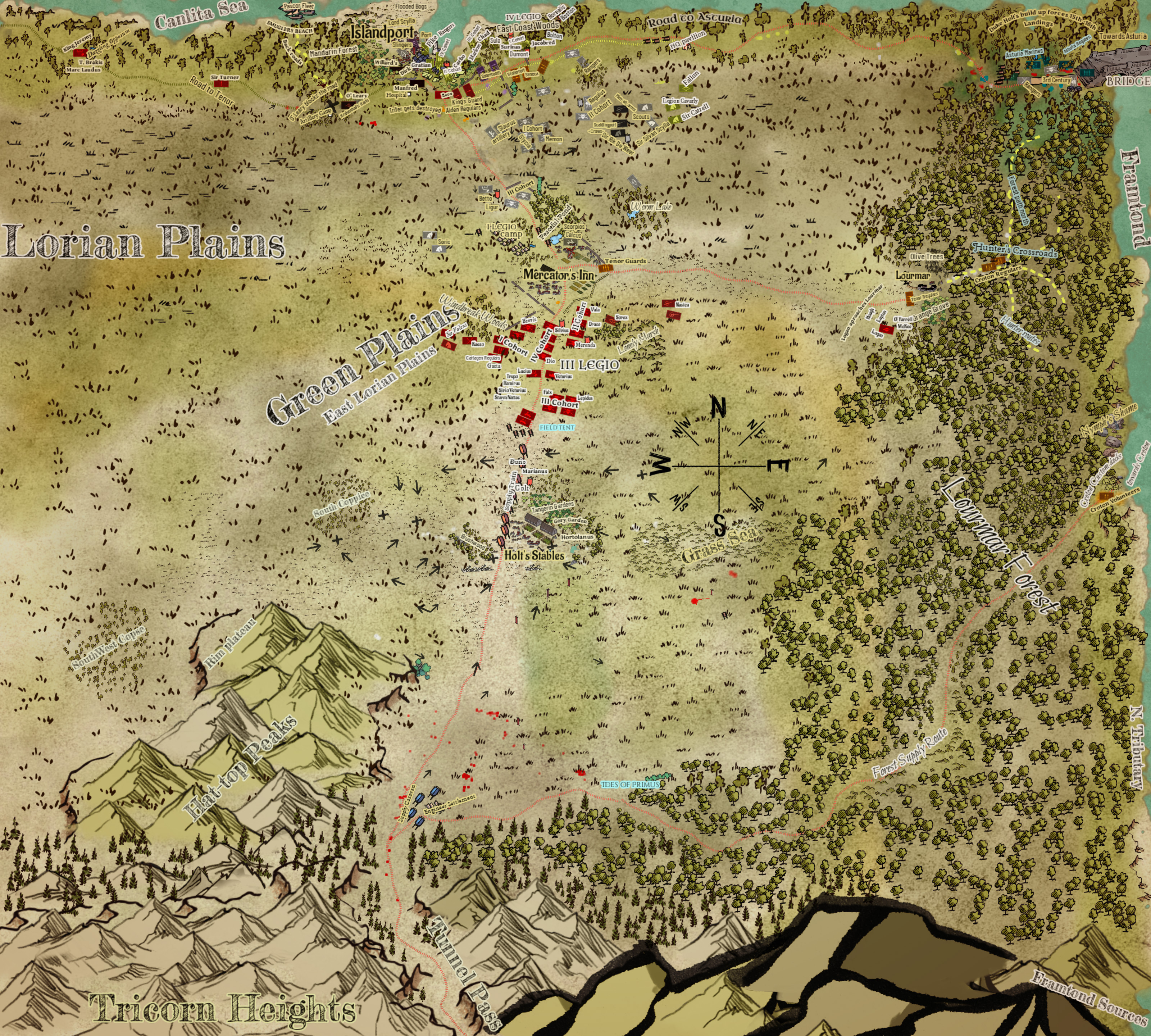 With the seriously battered Sula (the Legatus had been ill with fever for days and had suffered paralysis on the left side of his face) forced to retreat deep in the woods and getting bogged down near the coast, Ligur was focused on moving his units on the battlefield to tackle the next crisis missing the one unfolding behind his back. He ordered Regulus to leave a century near the road on Sula's east flank and bring the rest of the 2nd Cohort south towards Worm Lake forest. Glycia pivoted the intact 1st Cohort and started marching towards the fortifications built west of Peaceful Pond at the north exit out of Mercator's Inn. The intention was to join with Prefect Betto's remnants of the 3rd Cohort, Sorio and Celsus creating a front that was to attempt to stop Lucius.