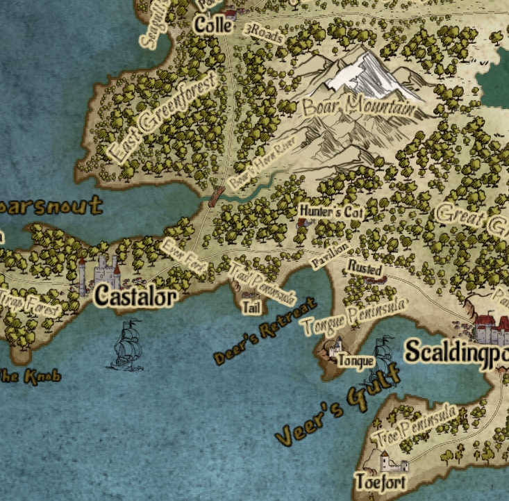 The fork's legs were about ten to fifteen kilometers from Castalor, Boar's Bridge and Hunter's Cot and while not accurate the locals name had stuck.