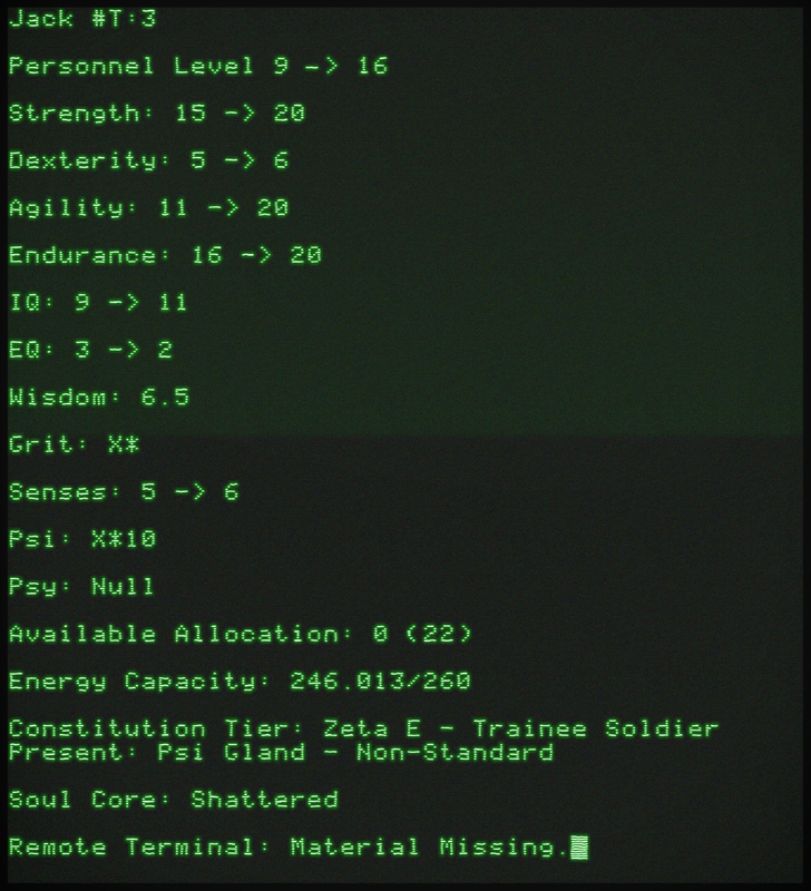 When he had been looking at his remaining 11 Allocation he had known that moving fast was as important as the rest. He had pumped in 9 to bring Agility up to max at 20. The last two went into IQ bringing it up to 11. The feeling of Allocating to Agility was mediocre, at best. Maybe it was the sensation of it clashing with the fact that his hand was still trapped and he couldn't move.