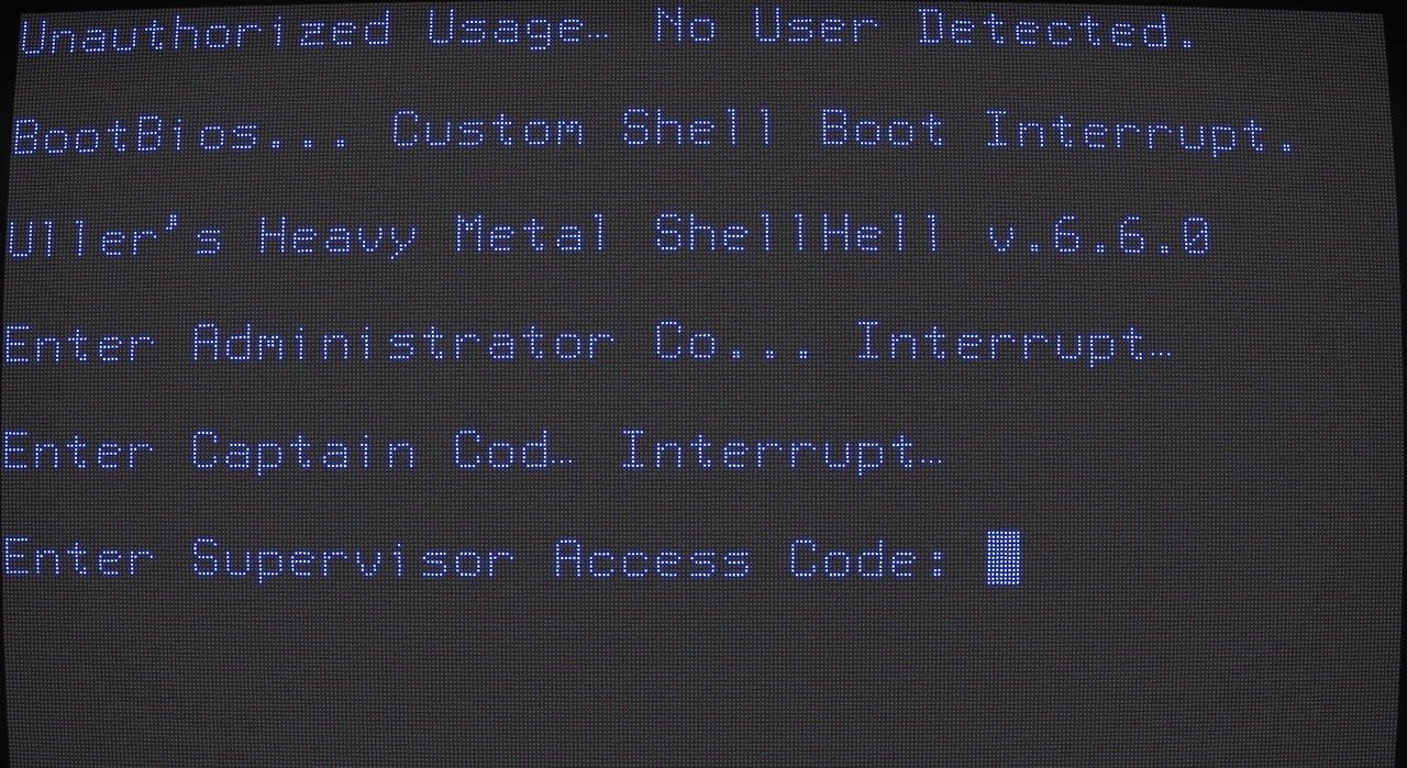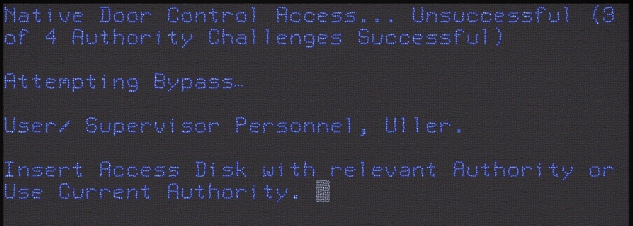 Uller had just finished working with Jonah to make Yuma some bullets. He had tried to pretend he couldn't make the explosives for the bullets but the pressure of their combined stares had worn him down. So now he was tired and he was having a real bitch cracking the Door Terminal. This was heavy stuff but at least it wasn't as odd as the last Terminals. This one was running a variant of Terminal OS.