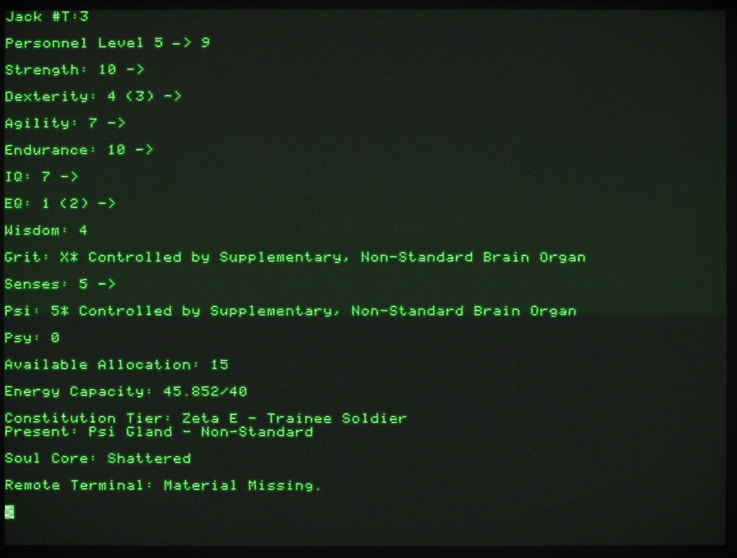 He pumped 5 into Endurance, closed his eyes and leaned his head back as he waited. He absolutely noticed an improvement in his health, "Will to Live," and in his total Energy Capacity, but it wasn't the world-shaking feeling he had been looking forward to. He debated for a second then thought better. He would wait a few Personnel Levels before pushing it to 20. The worst case would be hitting 20 and not have anything to show for it.