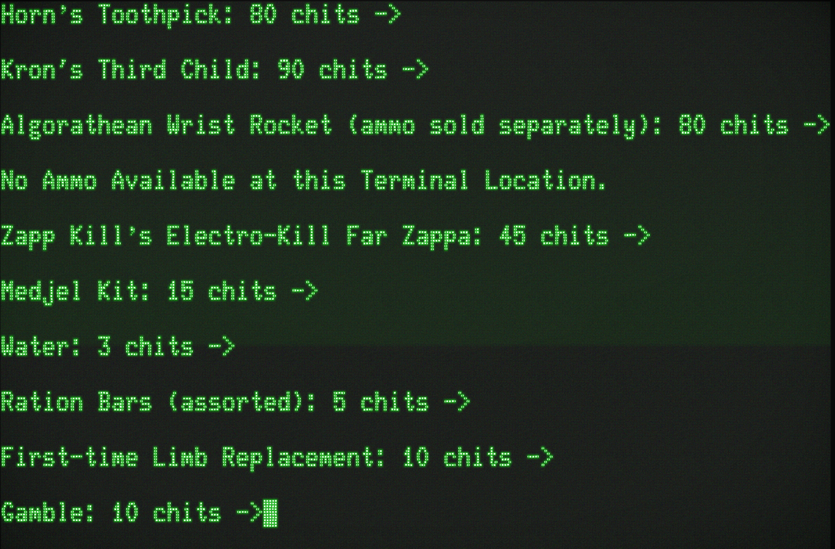 His eyes flashed back to the Terminal. He had no idea what any of these "NonStandard" items were but it seemed like an easy choice. He jabbed his finger onto the "Gamble" option. Feeling lucky that he might get the shield, some other useful thing, or even the mecha at dirt cheap.