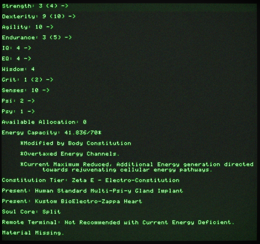 Reviewing the sheet again before Allocating her points he realized was uncomfortable having her Grit stay that low and adjusted his initial plans. He didn't need her dying on him but he also didn't need her freaking out and bringing another horde of crabs on his head or having her have a fit once she saw what a hatchet job her surgery had ended up being. He also had no idea how her Constitution Advancement or her BioElectro-Zappa Heart would affect her. He slapped two points into Grit bringing it to three and then jammed all three remaining points into Endurance bringing it past the boost at 5 to 6. Her body should finally start helping him keep her alive. It was its damn job after all, not his.