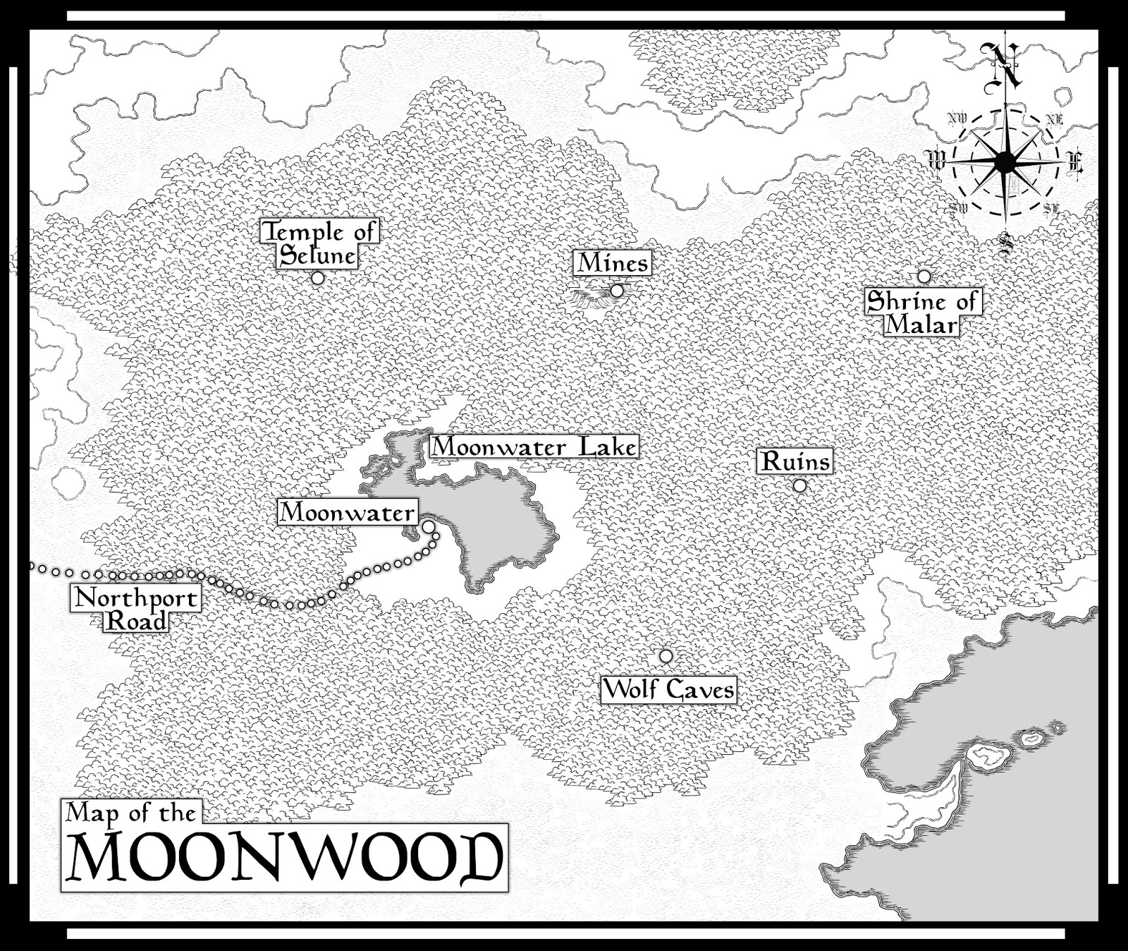Before we turned in, however, we met in the common room to consider our plans for the next day. As hoped, the townsfolk had copied one of their maps of the forest for us, and Bessie had marked the points of interest that the witch had mentioned. Spreading the map over the table in the otherwise deserted common room, we began plotting how best to use this information.