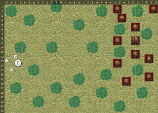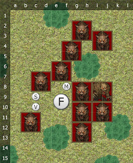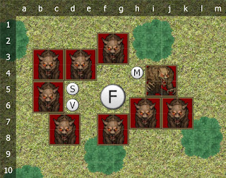 On our guard, we stayed close to the ground and the safety of the trees, keeping an eye on our surroundings. And then we saw them, crashing through the forest. Ten of the fiendish dire wolves, and, in their midst, a massive werewolf armed and armored with sword and shield.