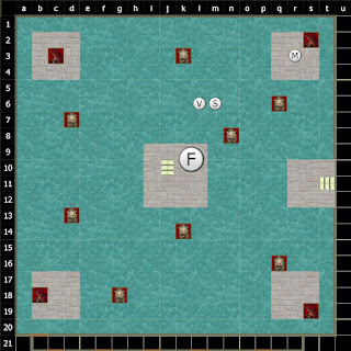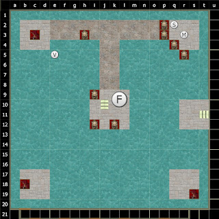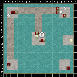 The space was wide, and open, a square roughly one hundred feet on a side with a ceiling that was twenty feet above the level of the water. Briny water filled the room, extending to a depth of thirty feet. The magical lights illuminating the room revealed that the only solid ground was six platforms of stone rising up from the water.